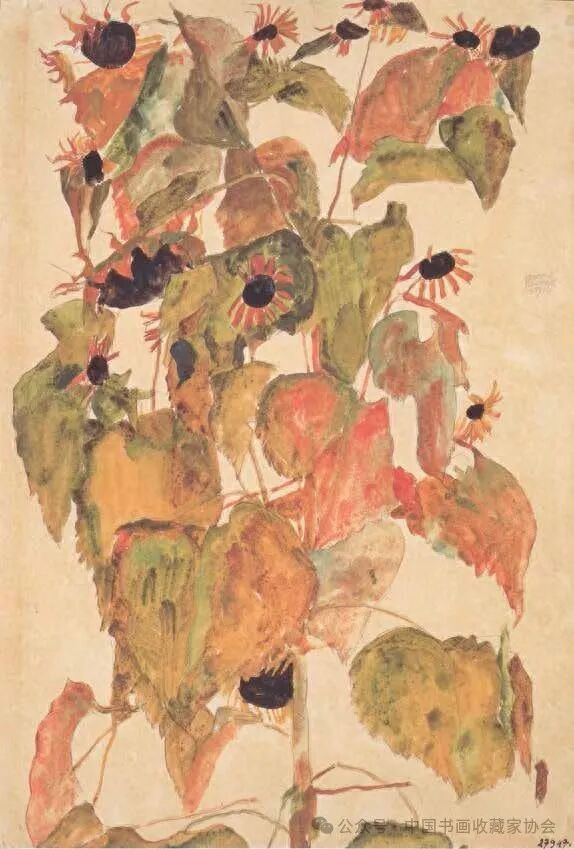 ? 这幅向日葵,颜色比较早的向日葵更明快,条线流畅,水彩效果突出,留白恰当,席勒个人绘画特点十足。