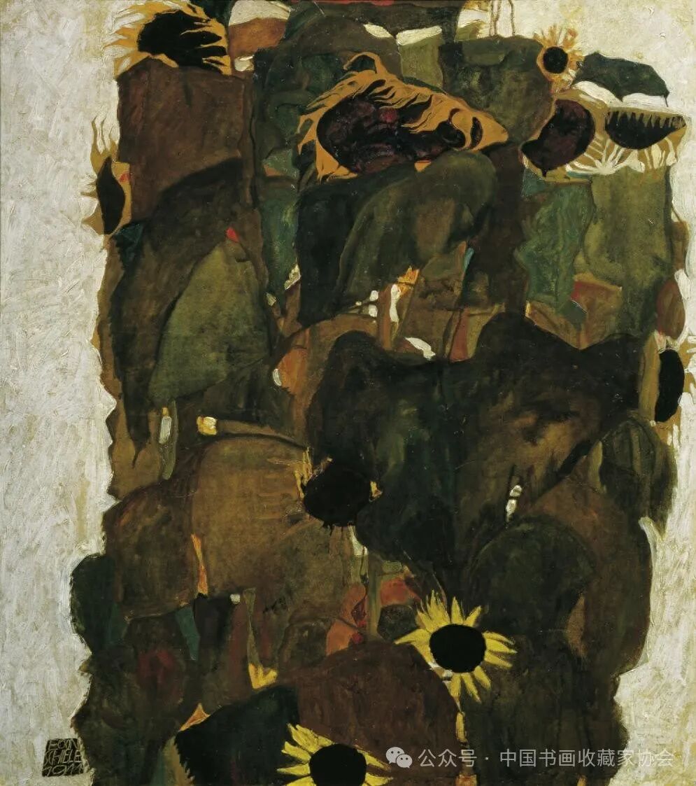 ? 席勒的这幅《向日葵》又是另一种风格,葵花藏在厚厚的叶子后面,偶尔露峥嵘。