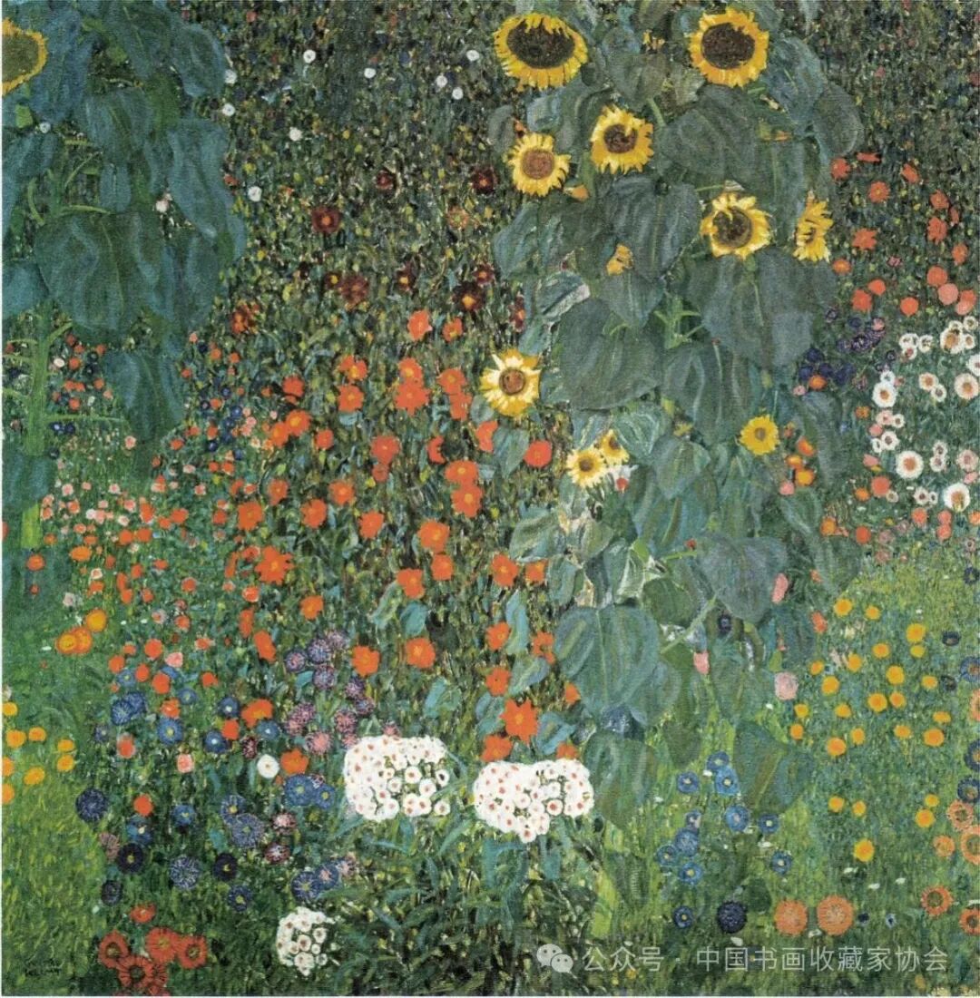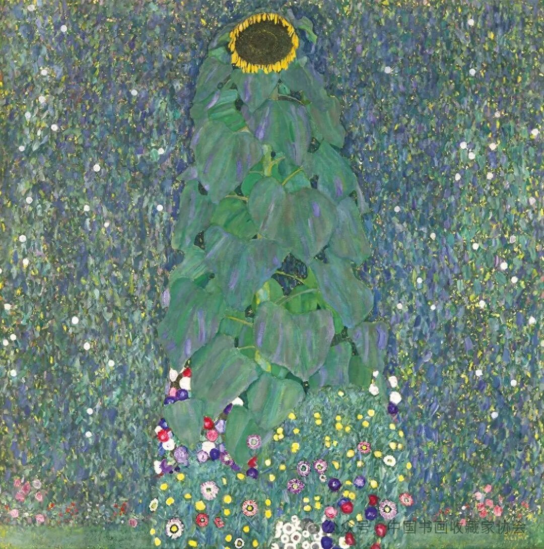 ? 这幅画突出了一朵向日葵,连同其叶子,克里姆特把向日葵画得像一盏灯,叶子就像光线,照得地面五彩斑斓。相比梵高的一朵朵像熄灭的太阳的《向日葵》,克里姆特的《向日葵》更有生机和希望。