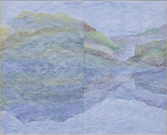 作品《向云端》以珐琅彩、矿物色等为基底,以白色天然植物纤维和动物纤维为点睛,组成的云雾自然覆盖在山水之上,为整个画面增添了一份神秘而浪漫的氛围,描绘了画家心中探求的梦幻世界和理想之境。通过虚实之间的构筑和相互映射,试图让观者去感受人与自然和谐共生,感悟生命、感受生活、敬畏自然,去探寻本我与真我。