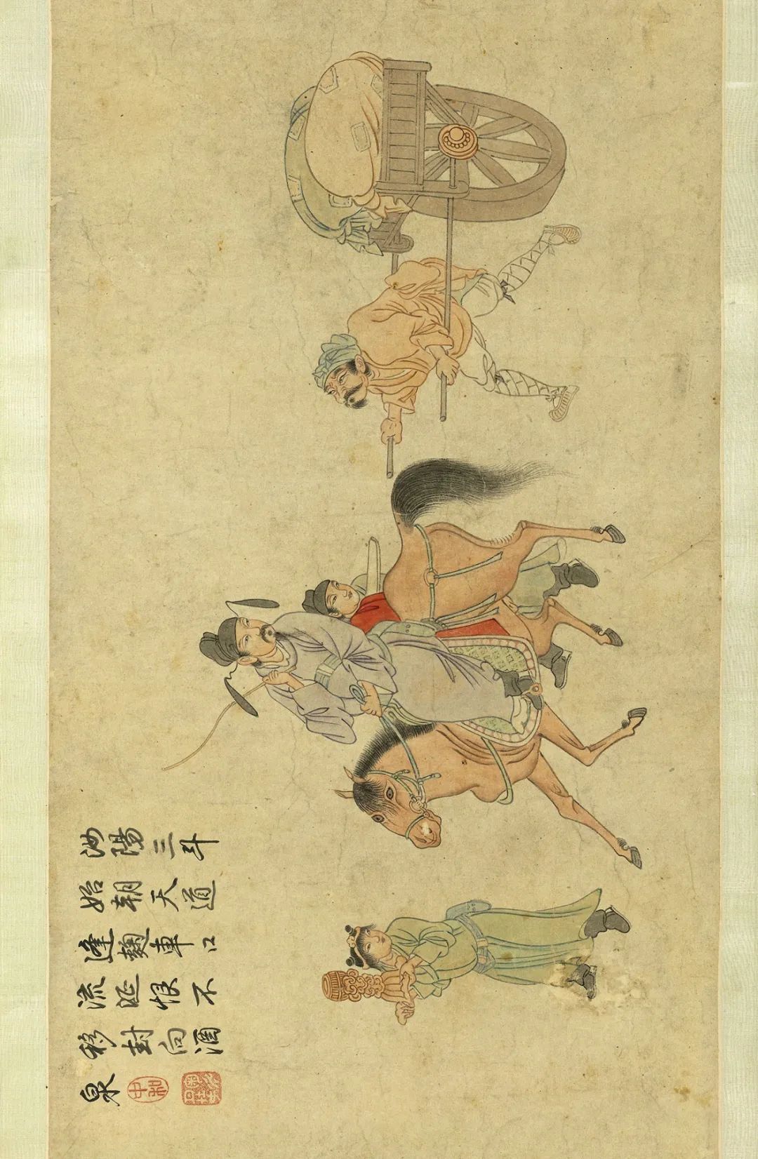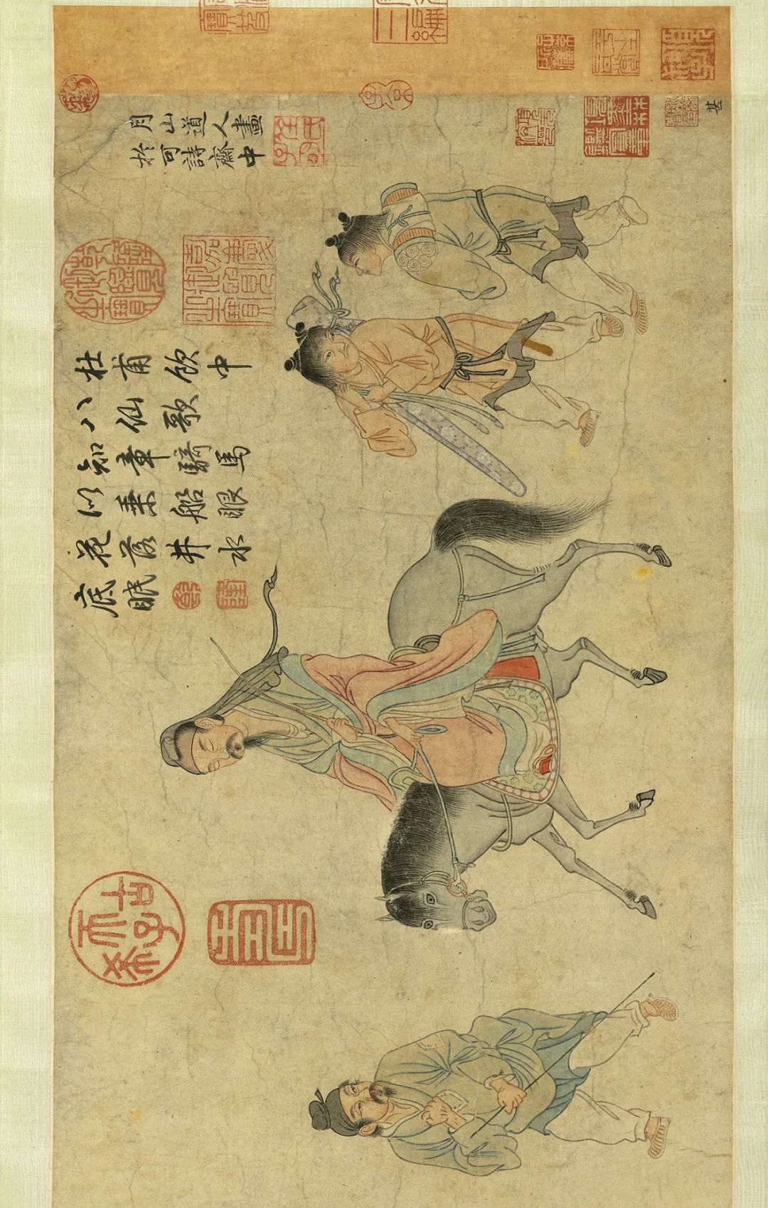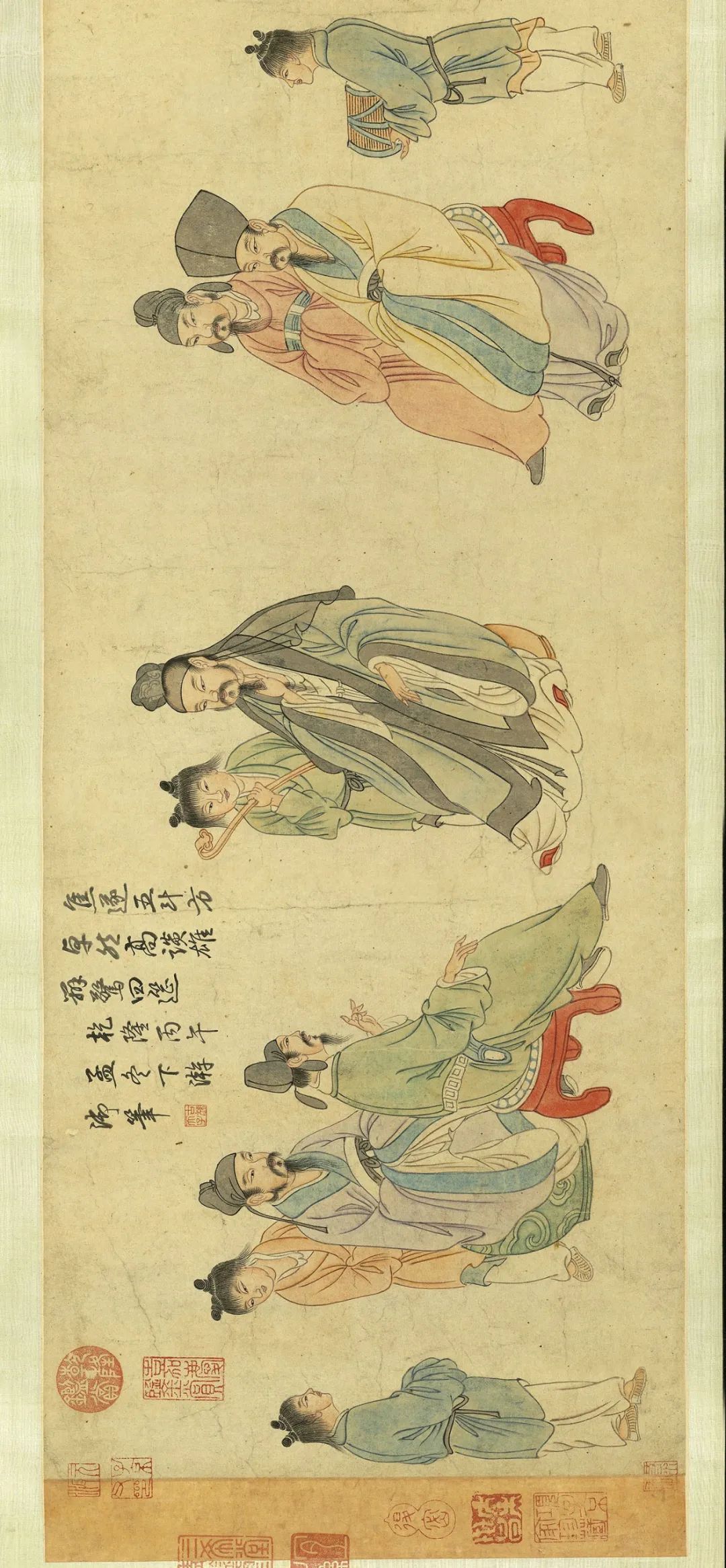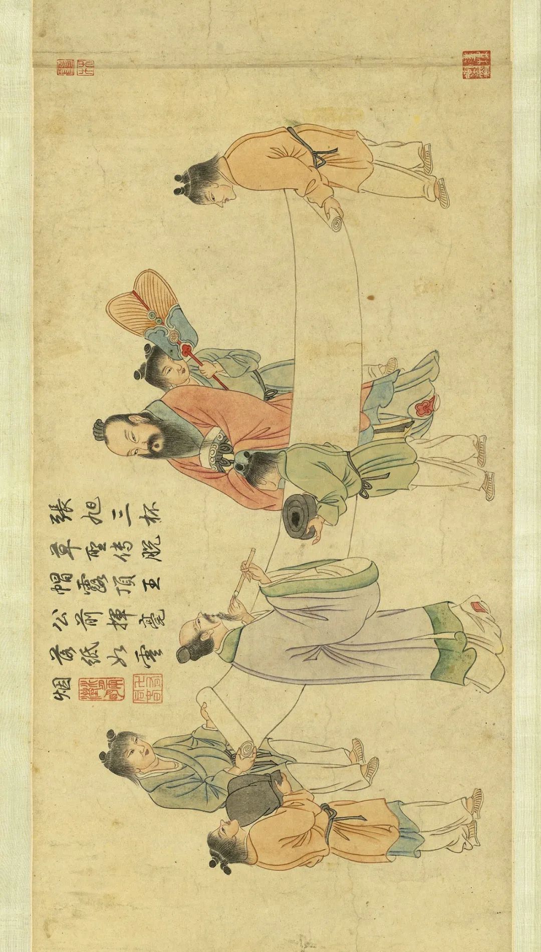 《饮中八仙图》卷旧传由元代任仁发绘,纸本设色,主画 26.7x447.3 厘米。画卷内容取材于杜甫《饮中八仙歌》诗意,描绘唐代八位名士:贺知章、李琎、李适之、崔宗之、苏晋、李白、张旭、焦遂醉酒的生动情态。人物造形具雅逸趣味,笔墨力道稍弱,或出于明人手笔。此卷现藏于台北故宫博物院。