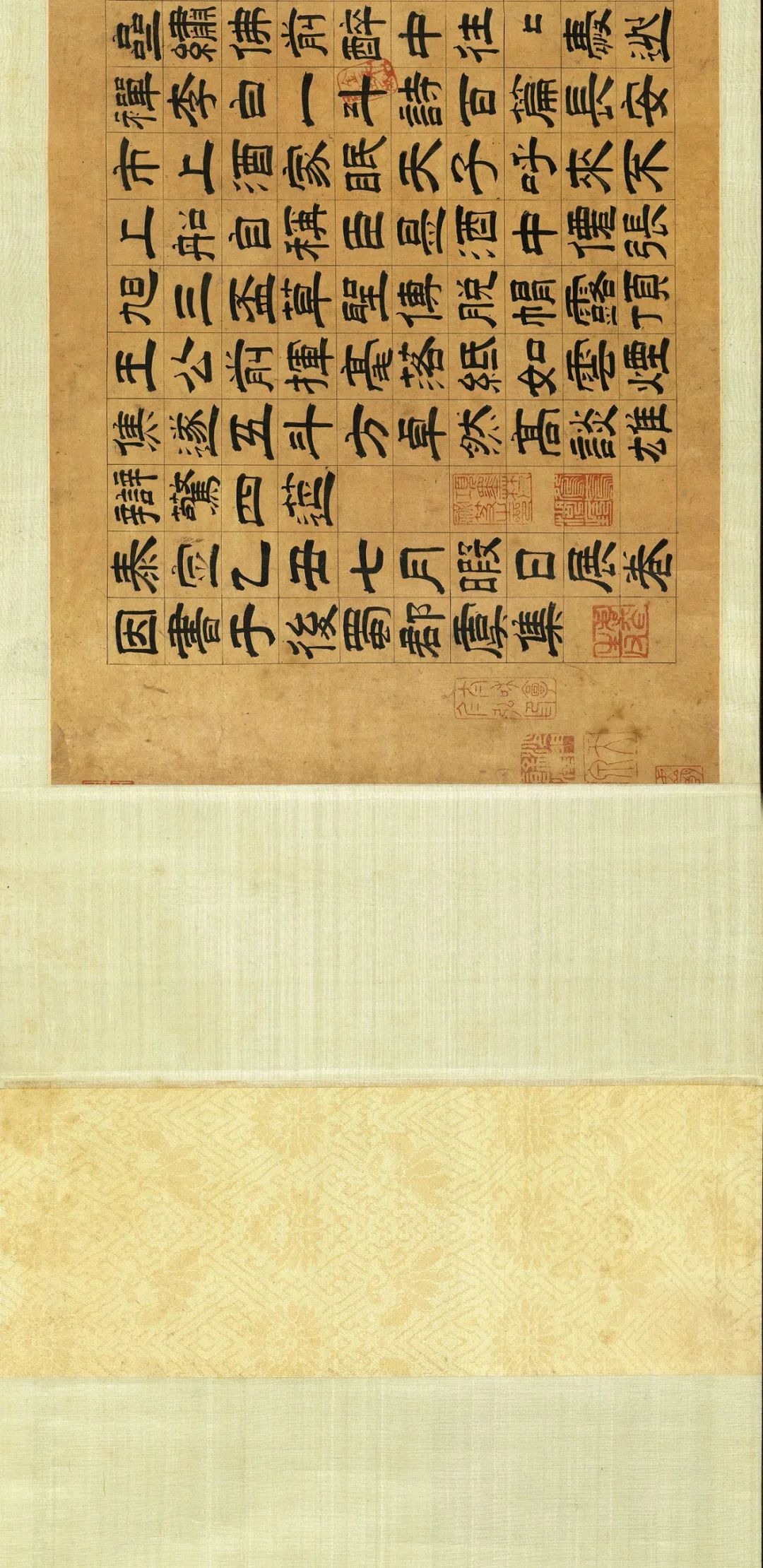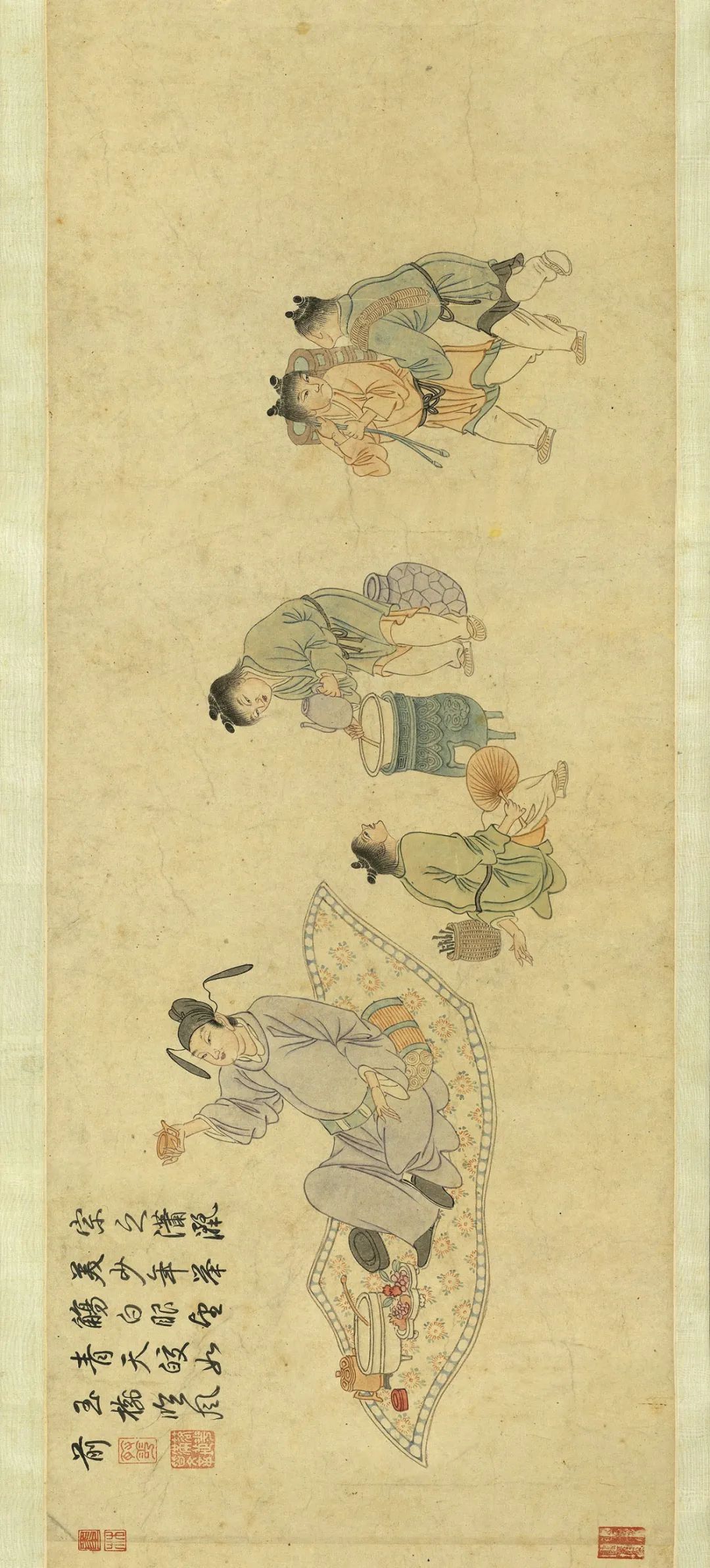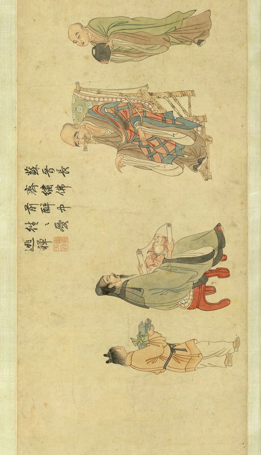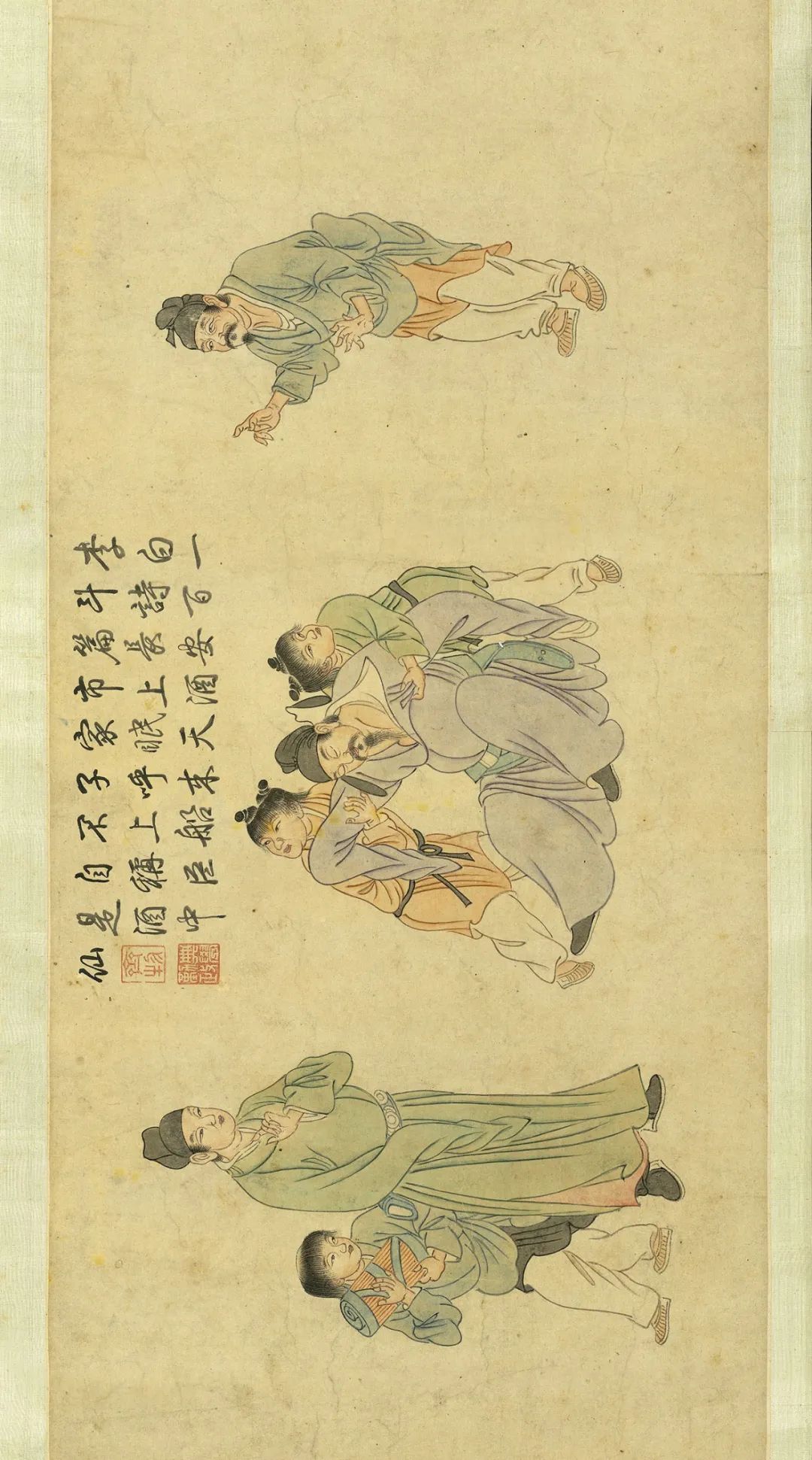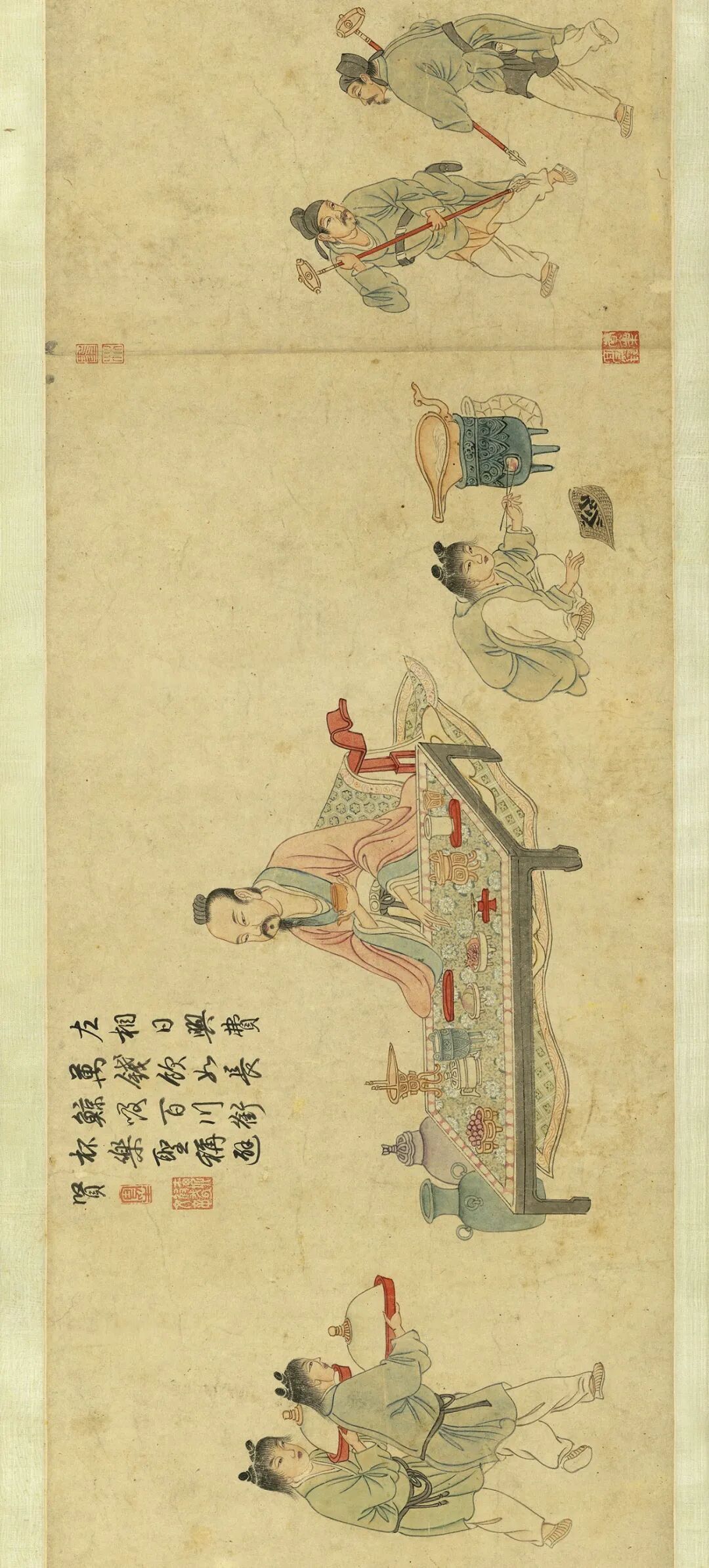 《饮中八仙图》卷旧传由元代任仁发绘,纸本设色,主画 26.7x447.3 厘米。画卷内容取材于杜甫《饮中八仙歌》诗意,描绘唐代八位名士:贺知章、李琎、李适之、崔宗之、苏晋、李白、张旭、焦遂醉酒的生动情态。人物造形具雅逸趣味,笔墨力道稍弱,或出于明人手笔。此卷现藏于台北故宫博物院。